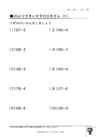 100までの数の足し算・引き算◆100より小さい数-1桁の数(繰下なし) ↑ クリックすると ダウンロードできます ↑ クリックすると ダウンロードできます 例)57-5、73-1 もっともっとたくさん、お子様に この問題の練習をさせたいと思いませんか? 『ポッ!プりんと』は、 数字だけが違う問題プリントを、 何枚でも印刷できます! こちらへGo!