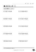小数の足し算・引き算◆[暗算]小数の足し算(繰上なし) ↑ クリックすると ダウンロードできます ↑ クリックすると ダウンロードできます 例)0.2+0.3、0.8+0.1 もっともっとたくさん、お子様に この問題の練習をさせたいと思いませんか? 『ポッ!プりんと』は、 数字だけが違う問題プリントを、 何枚でも印刷できます! こちらへGo!