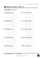 小数の足し算・引き算◆[筆算]小数の足し算(小数点位置注意) ↑ クリックすると ダウンロードできます ↑ クリックすると ダウンロードできます 例)2.7+1.3、3.0+3.8 もっともっとたくさん、お子様に この問題の練習をさせたいと思いませんか? 『ポッ!プりんと』は、 数字だけが違う問題プリントを、 何枚でも印刷できます! こちらへGo!