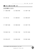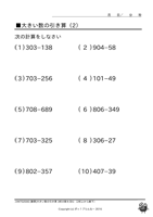 大きい数の足し算・引き算◆[筆算]3桁数から引く(2桁上から繰下) ↑ クリックすると ダウンロードできます ↑ クリックすると ダウンロードできます 例)205-136、308-249 もっともっとたくさん、お子様に この問題の練習をさせたいと思いませんか? 『ポッ!プりんと』は、 数字だけが違う問題プリントを、 何枚でも印刷できます! こちらへGo!