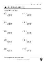 小数の割り算◆[筆算]小数第一位までの数÷1桁整数 ↑ クリックすると ダウンロードできます ↑ クリックすると ダウンロードできます 例)8.1÷3、7.2÷4 もっともっとたくさん、お子様に この問題の練習をさせたいと思いませんか? 『ポッ!プりんと』は、 数字だけが違う問題プリントを、 何枚でも印刷できます! こちらへGo!