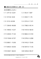 小数の引き算◆[筆算]小数点以下の桁数が異なる ↑ クリックすると ダウンロードできます ↑ クリックすると ダウンロードできます 例)322.8-0.63、421.1-4.759 もっともっとたくさん、お子様に この問題の練習をさせたいと思いませんか? 『ポッ!プりんと』は、 数字だけが違う問題プリントを、 何枚でも印刷できます! こちらへGo!