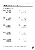 小数の足し算◆[筆算]解の小数点以下の桁数に注意 ↑ クリックすると ダウンロードできます ↑ クリックすると ダウンロードできます 例)3.25+2.75、0.28+2.372 もっともっとたくさん、お子様に この問題の練習をさせたいと思いませんか? 『ポッ!プりんと』は、 数字だけが違う問題プリントを、 何枚でも印刷できます! こちらへGo!