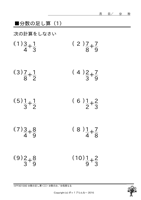 分数の足し算・引き算◆足し算(真分数のみ、分母が異なる) ↑ クリックすると ダウンロードできます ↑ クリックすると ダウンロードできます 例)2/5+4/7、2/3+5/9 もっともっとたくさん、お子様に この問題の練習をさせたいと思いませんか? 『ポッ!プりんと』は、 数字だけが違う問題プリントを、 何枚でも印刷できます! こちらへGo!