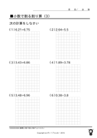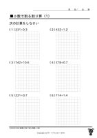 小数で割る割り算◆[筆算]商が1より大きい ↑ クリックすると ダウンロードできます ↑ クリックすると ダウンロードできます 例)10.56÷3.3=3.2 もっともっとたくさん、お子様に この問題の練習をさせたいと思いませんか? 『ポッ!プりんと』は、 数字だけが違う問題プリントを、 何枚でも印刷できます! こちらへGo!